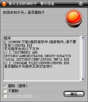 在已安裝使用微點(diǎn)主動(dòng)防御軟件的用戶,無(wú)須任何設(shè)置,微點(diǎn)主動(dòng)防御將自動(dòng)保護(hù)您的系統(tǒng)免受該病毒的入侵和破壞。無(wú)論您是否已經(jīng)升級(jí)到最新版本,微點(diǎn)主動(dòng)防御都能夠有效清除該病毒。如果您沒(méi)有將微點(diǎn)主動(dòng)防御軟件升級(jí)到最新版,微點(diǎn)主動(dòng)防御軟件在發(fā)現(xiàn)該病毒后將報(bào)警提示您發(fā)現(xiàn)“未知木馬”,請(qǐng)直接選擇刪除處理(圖2所示);