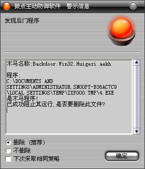 如果您已經(jīng)將微點(diǎn)主動(dòng)防御軟件升級(jí)到最新版本,微點(diǎn)將報(bào)警提示您發(fā)現(xiàn)&Backdoor.Win32.Huigezi.aekh”,請(qǐng)直接選擇刪除(圖3所示)。