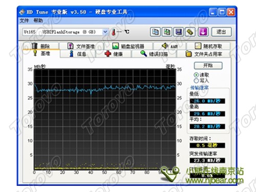 HD Tune是一款小巧易用的硬盤工具軟件,其主要功能有磁盤傳輸速率檢測,健康狀態檢測,溫度檢測及磁盤表面掃描等。PNY臉譜盤(8GB)在該軟件下的表現為:最小傳輸率26.0MB/秒,最大傳輸率29.6MB/秒,平均傳輸率28.2MB/秒,存取時間為0.5 ms,突發傳輸速率23.3MB/秒,測試曲線無大幅波動。
