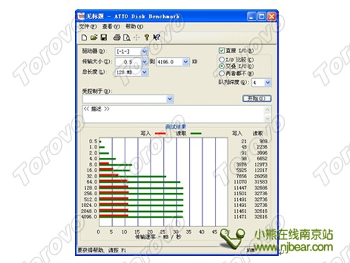 ATTO Disk Benchmark是一款比較流行的硬盤測試工具,也是這次測試中最重要的軟件之一,它是由ATTO公司出品的一款磁盤/網絡性能測試工具,該軟件使用了64KB—256MB的測試包,數據包按0.5K、1.0K、2.0K直到到8192KB進行分別讀寫測試,測試完成后數據用柱狀圖的形式表達出來。很好的說明了文件大小比例不同對磁盤速度的影響。本次測試用的是128MB測試包檢驗0.5—4196KB的讀寫速度。結果PNY臉譜盤(8GB)的最高讀取速度為32.7MB/秒,最高寫入速度為11.4MB/秒,表現優異。