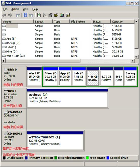 第二張圖是在Windows磁盤(pán)管理里的樣子,也可以看到是兩個(gè)不同的設(shè)備,而不是普通的U盤(pán)分區(qū)。