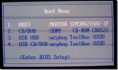 關機,插上U盤,啟動電腦,按F12或類似按鍵打開Boot Menu,如上圖,選擇USB HDD,即可啟動Windows 7冷啟動安裝過程,這種安裝方式是可以進行分區等操作的,也可以用來把Windows 7灌裝到一個vhd(虛擬硬盤)文件里。而如果是在PE或其它Windows OS里用虛擬光驅加載Windows 7的安裝過程,則是不能夠分區和灌裝vhd的。