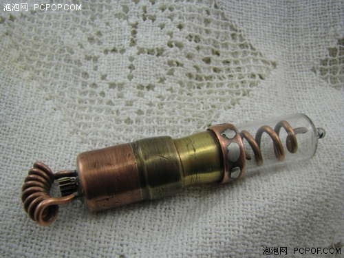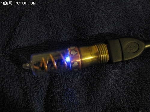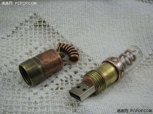 這款U盤很像一根針管,而頂部的小旋鈕應該是從手表上取下來的。上蓋和下部分可以分離,并且采用了旋轉的方式防止上蓋丟失。玻璃燈管內部含有LED燈,在通電使用時會發出藍色光芒。國外的牛人DIY能力真的很強。■